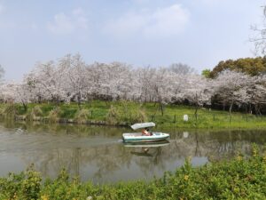 After our first breakfast buffet of the trip, featuring some very unusual options, we headed off in glorious weather to Gucun Park, a huge park just outside Shanghai, for our first – and hopefully not last – visit to the world-famous cherry blossoms. The park is dotted with cherry blossom trees in various colours, with the white blossoms currently at their peak.