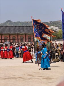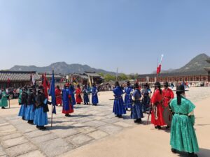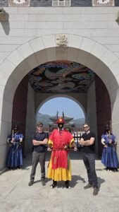 Nach einer kurzen Dusche in unserem Hotel gingen wir einen unserer Sightseeing Fehler vom ersten Tag ausmerzen und machten uns auf den Weg zum Gyeongbokgung Palace wo 2 Mal täglich der Wachwechsel und eine kurze zeremonielle Trainingseinheit stattfinden. Wir waren problemlos in der Lage der Zeremonie um 14 Uhr beizuwohnen und hatten sogar die Möglichkeit einen kleinen Schnappschuss mit dem Wachkommandanten zu schießen bevor uns das grillende Sonnenlicht wieder vertrieb.