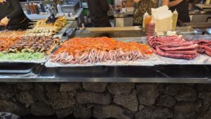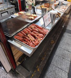 In Jeju, we also sampled our way through a street food market for the first time, at the Seogwipo Maeil Olle Market. Here, we started with a deep-fried breaded black pork roll stuffed with rice and vegetables – a deep-fried delight – and then worked our way through various snacks, from a variety of stuffed Korean dumplings to a kind of mochi. I must say the latter took a bit of getting used to.
