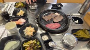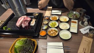 Unsere zweite große Erfahrung mit koreanischer Kulinarik war das Korean BBQ. Gefühlt hat jedes dritte Restaurant hier eine Form von Korean BBQ angeboten, bei dem das rohe Fleisch und Gemüse am Tisch gegrillt wird. Hier haben wir auch verschiedene Varianten, von Gasgrill über Holzkohlegrill bis hin zu heißem Stein, erlebt. Bei unserem ersten Mal mussten wir uns zuerst das Fleisch im darunterliegenden Shop (der Teil des Restaurants war) kaufen und mit hoch ins Restaurant nehmen, um es dort dann zu grillen.
