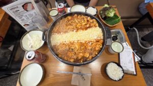 Zu unseren besten Erfahrungen hier würde ich definitiv die beiden Male auf Jeju zählen. Beide Male aßen wir Jeju black pork und beim zweiten Mal wurden wir von einem netten koreanischen Geschäftsmann eingeladen, den wir zuvor bei unserer Hallasan-Wanderung kennenlernten. Er hat uns gemeinsam mit seinem Sohn gezeigt wie man Korean BBQ richtig isst und dort haben wir auch gelernt, dass eine dieser kimchibasierten Suppen dabei nicht fehlen darf. Definitiv ein einzigartiges Erlebnis für uns.