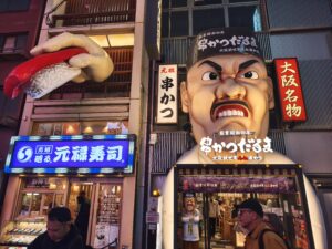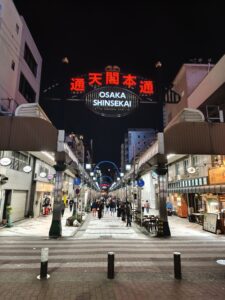 We then returned to our hotel and rested until sunset, planning to climb the viewing platform of Tsūtenkaku Tower at night and explore the nightlife of Shinsekai Market. No sooner said than done. After our first dinner in Japan – sushi and Wagyu beef – we climbed the tower followed by a nice stroll through the brightly lit alleys of the market. And I have to say, the effort that has gone into decorating the walls and streets with figures and paintings was, in places, absolutely mad but impressive.